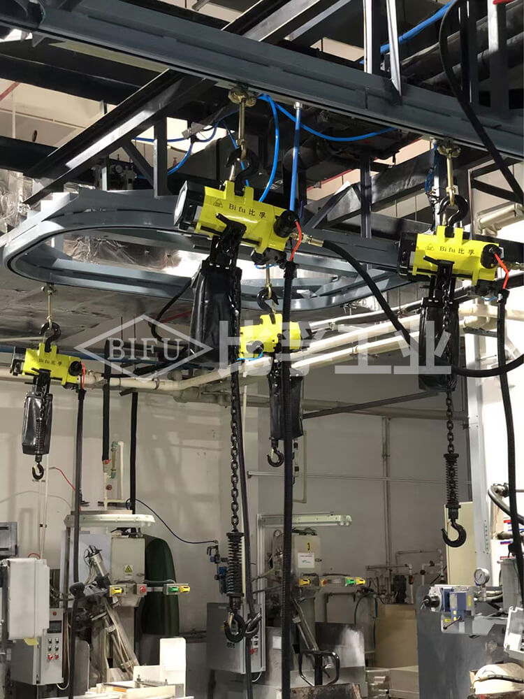 氣動葫蘆配氣動轉向環形軌道上下料應用案例。